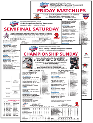 Dubuque, Kansas City, Omaha and Waterloo competed in the 2015 USA Hockey High School National Championships in Chesterfield, Missouri, March 19-23. All four teams advanced to the championship bracket after three games of pool play. Omaha and Waterloo lose in the quarterfinals, Kansas City is eliminated in the semifinals, and Dubuque loses 2-1 in the championship game to Cherry Creek, Colorado. |