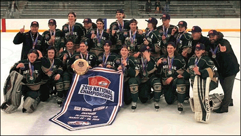 The Sioux City Metros became the first Iowa/Midwest High School Hockey League team to earn a national title winning the 2018 USA Hockey High School National Championships-Division II in Plymouth, Minnesota. After falling behind 2-0 in the championship game to Monarch, Colorado, the Metros rallied for a 3-2 victory. |